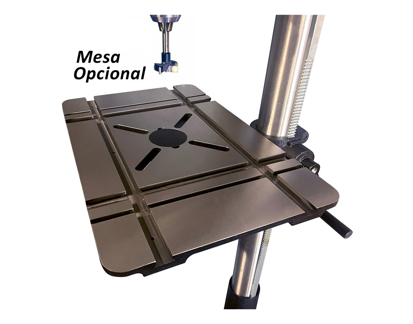 A sua mesa em ferro fundido de 345 x 345 mm proporciona excelente estabilidade durante o trabalho, enquanto o cone Morse MT3 garante ampla compatibilidade com diferentes brocas, mandris e machos de roscar. O curso de 120 mm permite trabalhar peças de várias dimensões com total controlo e precisão.