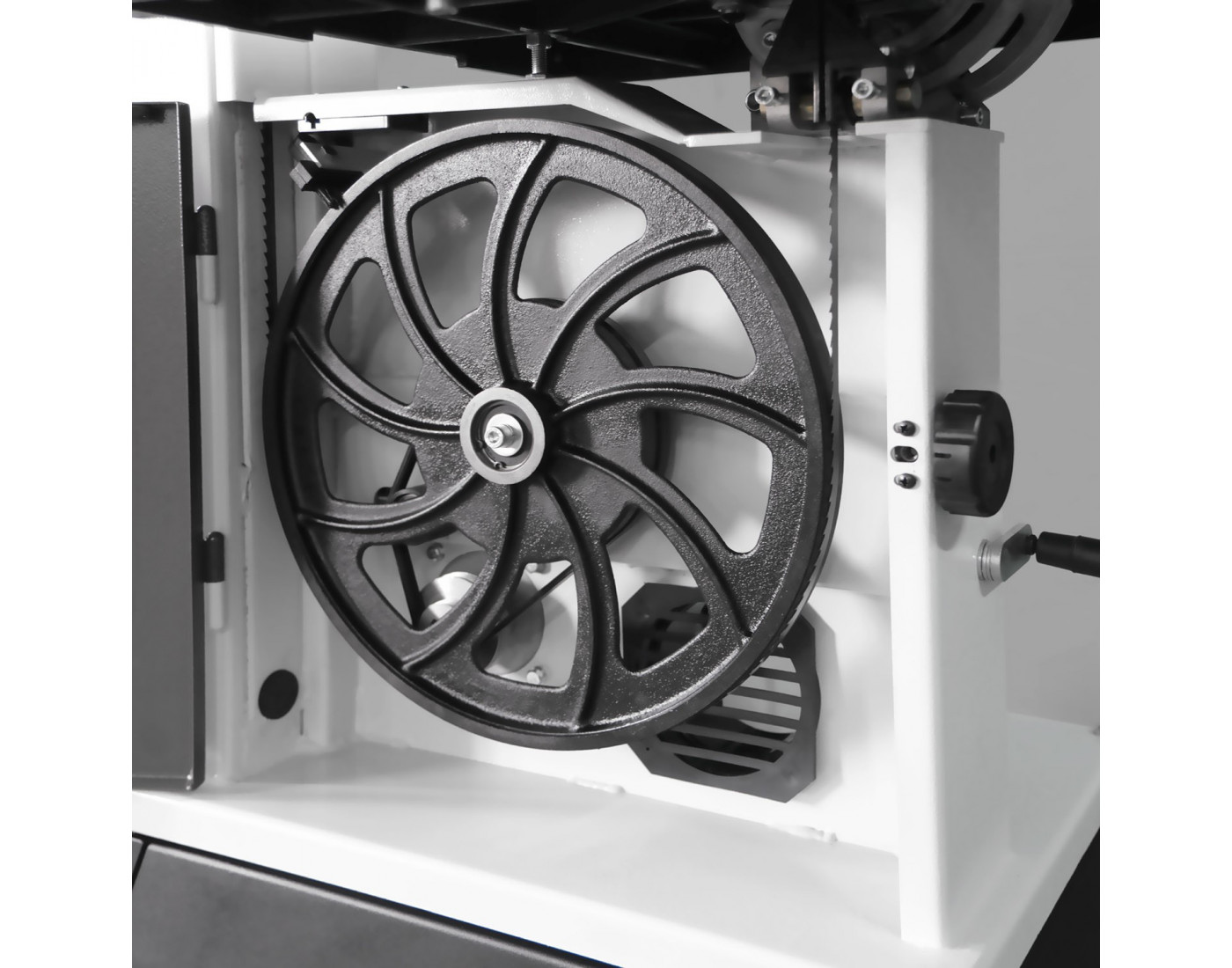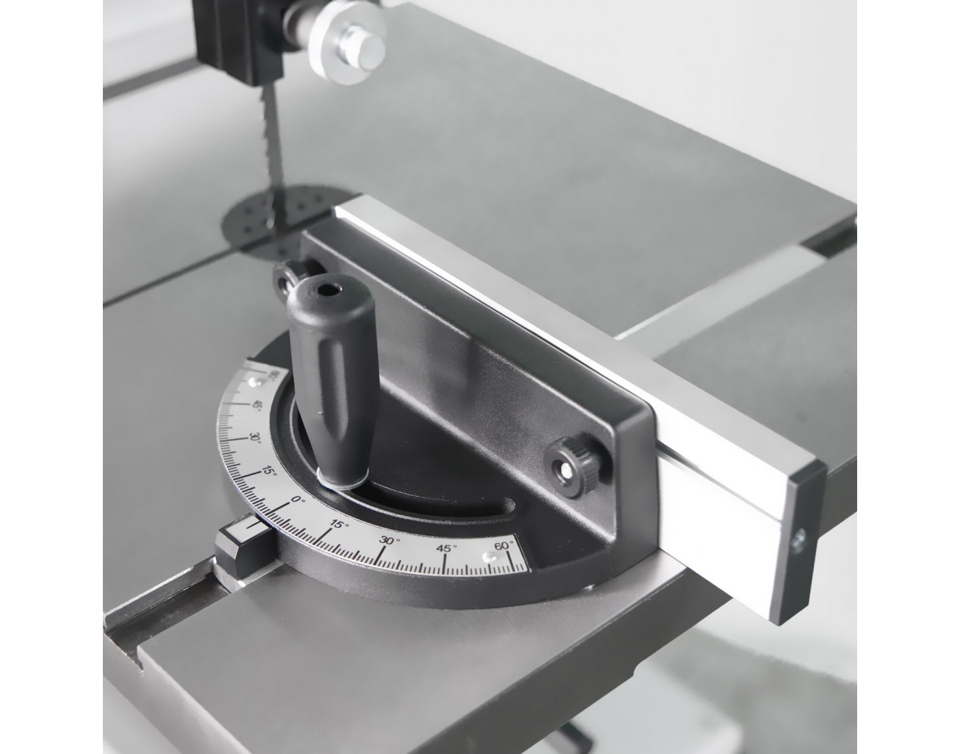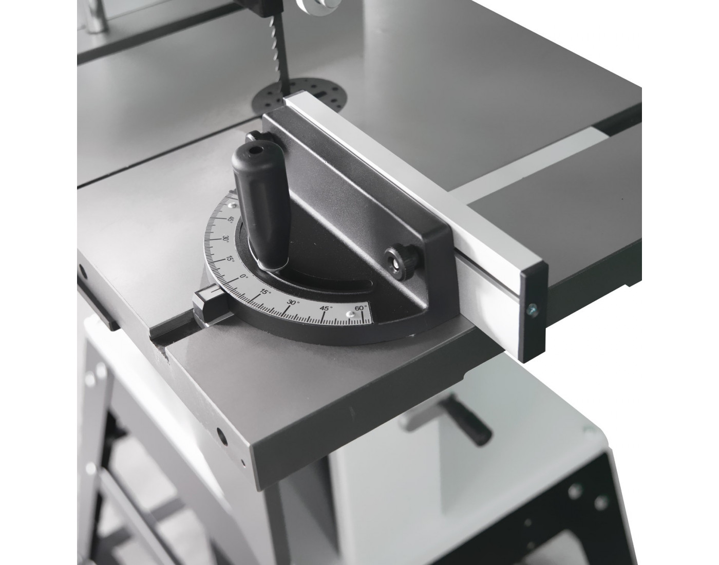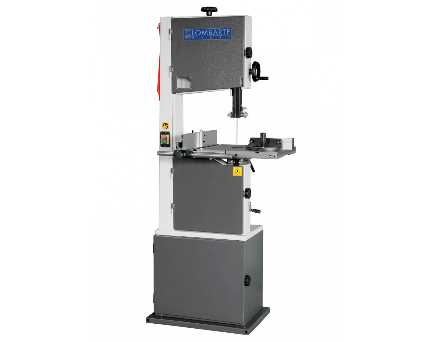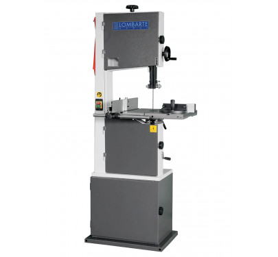 Serra de fita de nova geração, equipada com volantes e mesa em ferro fundido para máxima estabilidade e precisão. Incorpora um potente motor de 1,5 CV, guia de altura regulável por volante e mesa inclinável com botão e escala de graus para cortes em ângulo.