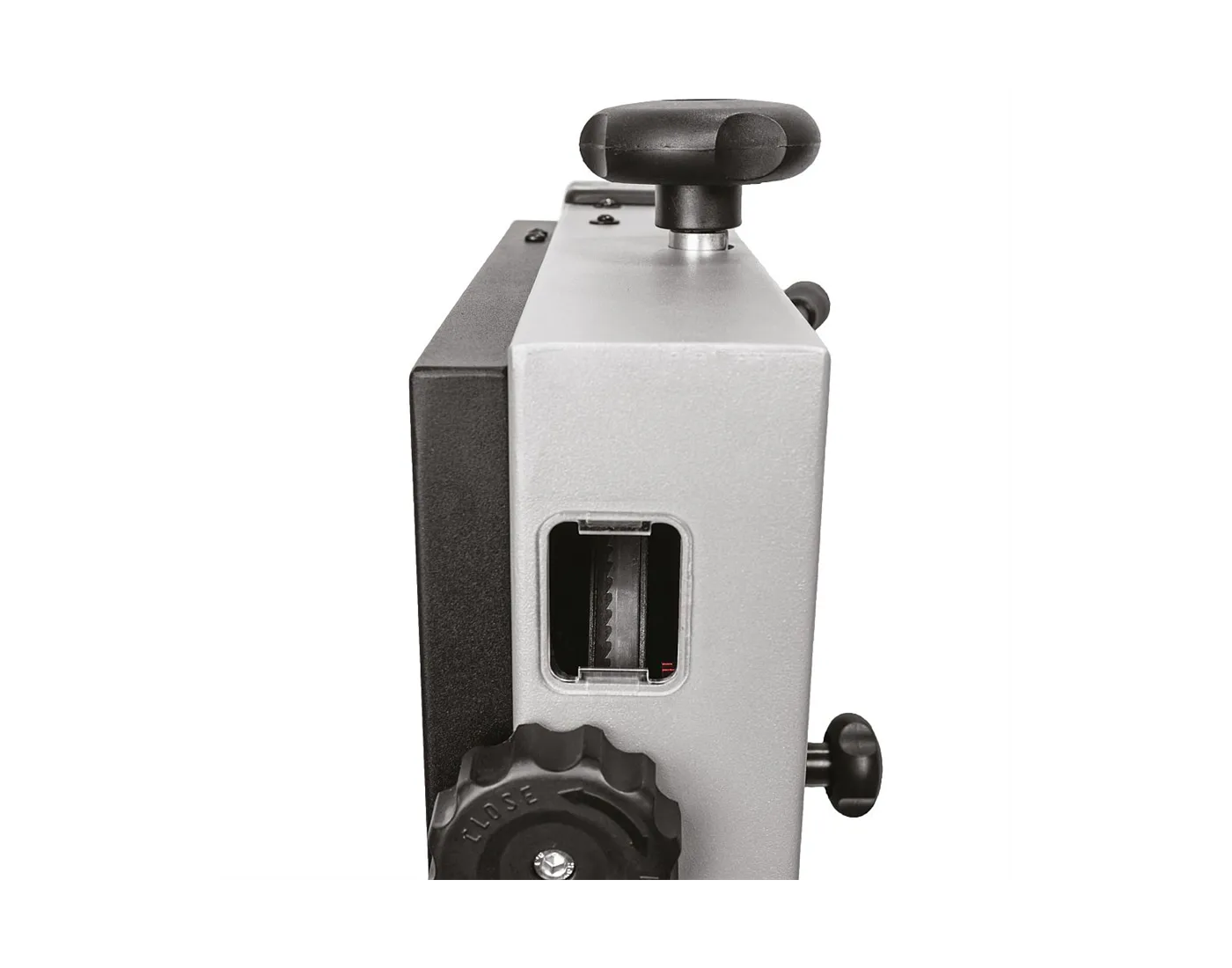 A máquina inclui mesa e volantes em ferro fundido, alavanca de libertação rápida para troca de lâmina e luz LED integrada para melhor visibilidade da área de trabalho. As duas velocidades de corte tornam-na adequada para uma ampla gama de materiais.
