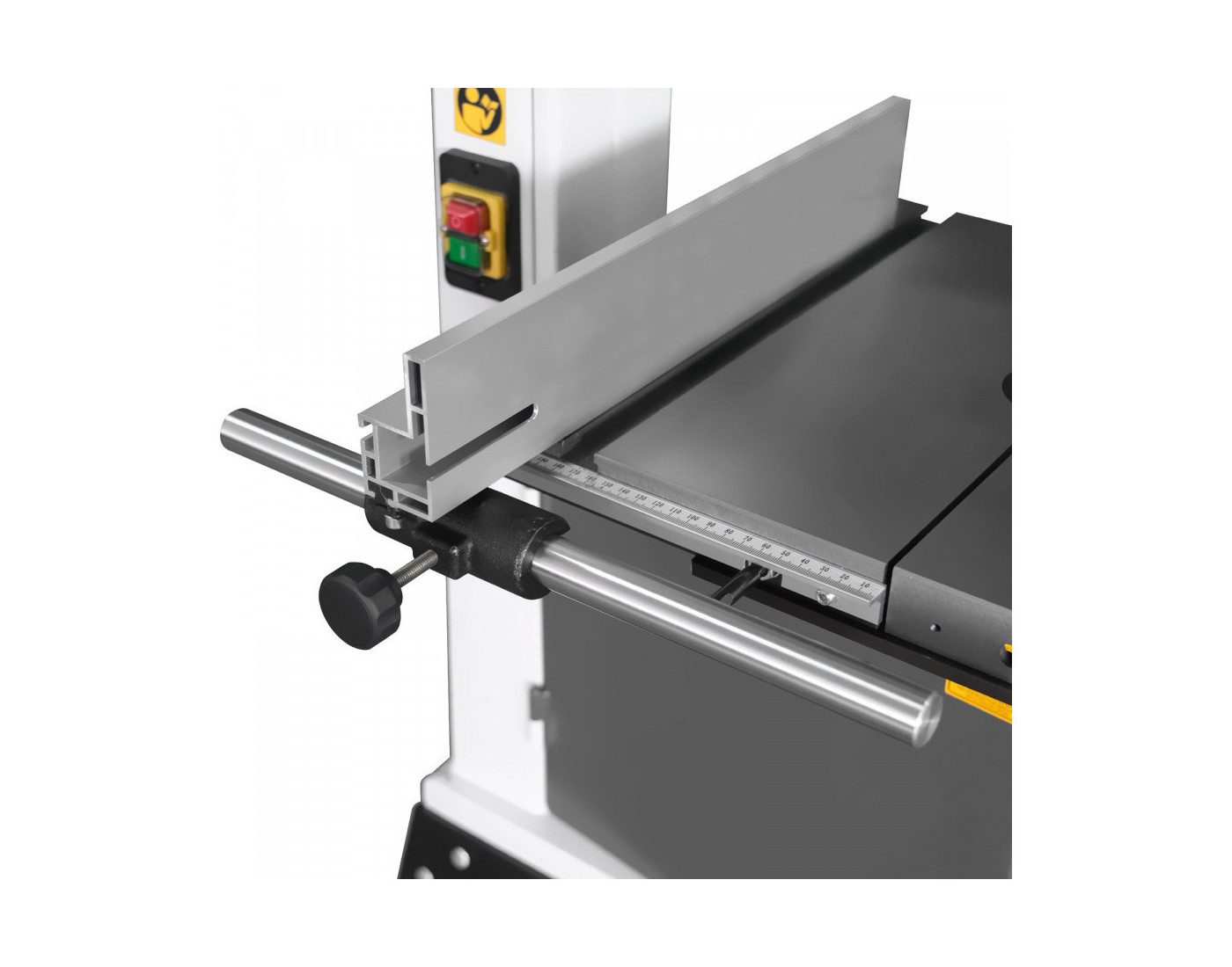 Serra de fita de bancada equipada com volantes em ferro fundido de 250 mm, concebida para garantir estabilidade e precisão durante o corte. Inclui guia paralela e manípulo de troca rápida de lâmina, facilitando a adaptação a diferentes tipos de trabalho.
